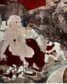 布袋和尚的背后是两对身着蒙古袍的儿童在摔跤,正面则是一群汉族儿童在摔跤,画面生动活泼,各族儿童其乐融融。太后庙还曾悬挂有8幅按中原礼制绘制的顺义王夫人三娘子的人生经历图,如元日、生辰、朝会、觐贺、贡献等场景。可惜这些画作于1908年被十三世达赖喇嘛随从德尔智获得,后转卖出国,至今下落不明。